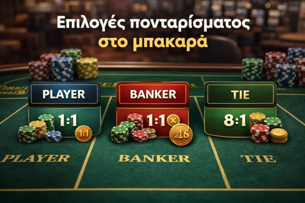 Στο μπακαρά, οι επιλογές πονταρίσματος είναι λίγες και ξεκάθαρες. Αυτό ακριβώς κάνει το παιχνίδι προσβάσιμο, αλλά και απαιτητικό σε επίπεδο πειθαρχίας, αφού κάθε επιλογή έχει διαφορετικό ρίσκο και διαφορετική μαθηματική συμπεριφορά.